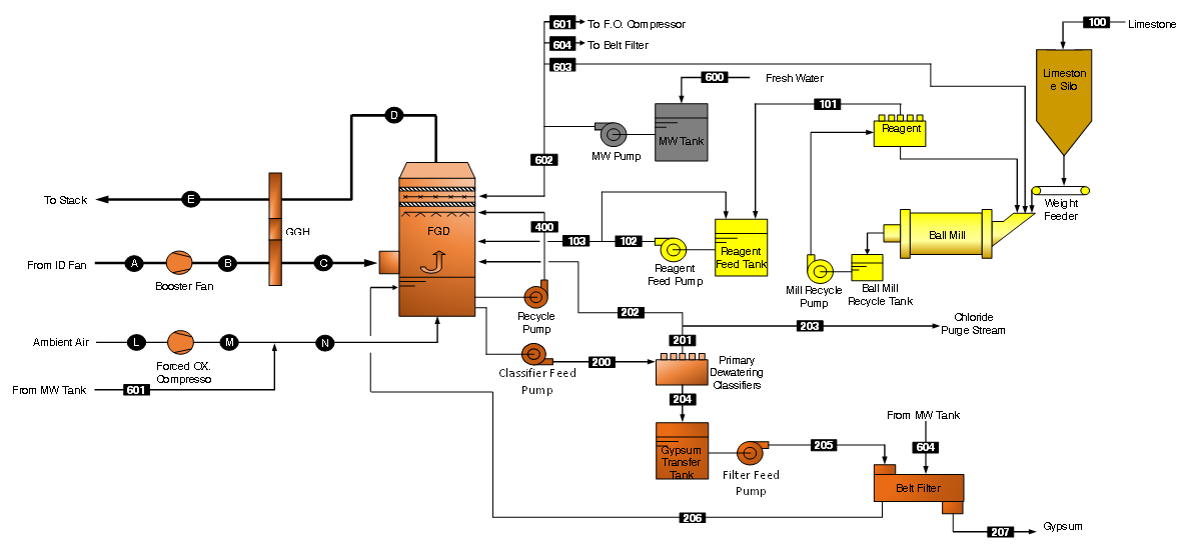 采用空塔噴淋技術(shù),原煙氣由吸收塔下部進入,經(jīng)循環(huán)液的多層噴淋洗滌,酸性污染物、粉塵等被脫除,反應(yīng)產(chǎn)物被固化收集。