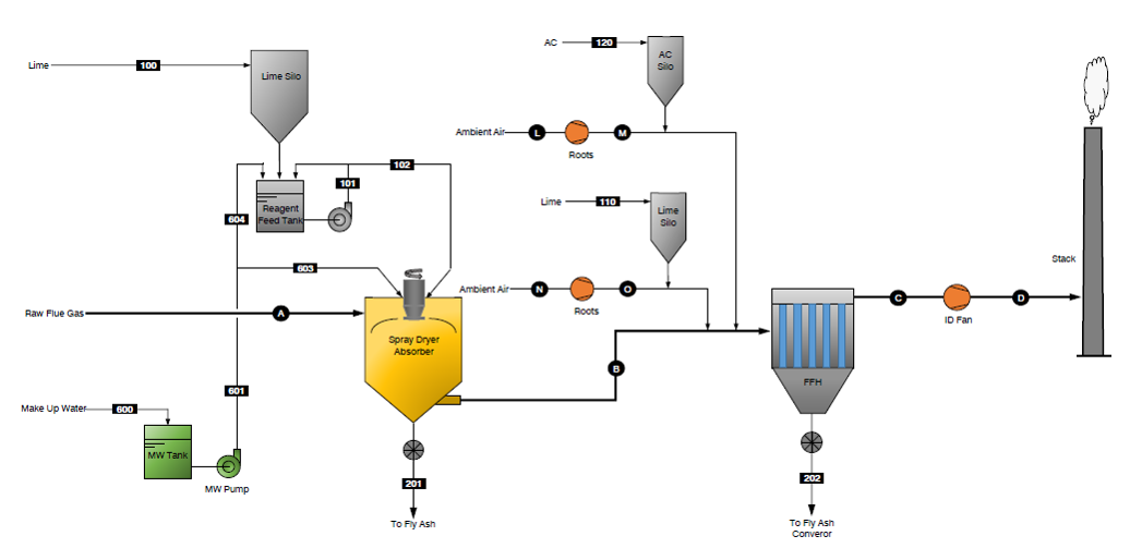 原煙氣經(jīng)進(jìn)風(fēng)煙道導(dǎo)流由頂部旋轉(zhuǎn)向下進(jìn)入反應(yīng)塔,石灰漿液通過霧化盤拖曳剪切成微小顆粒,在顆粒表面的液膜中進(jìn)行傳熱和傳質(zhì),脫除煙氣中的HCl、SO2等酸性物質(zhì)經(jīng)布袋除塵器過濾后排出。