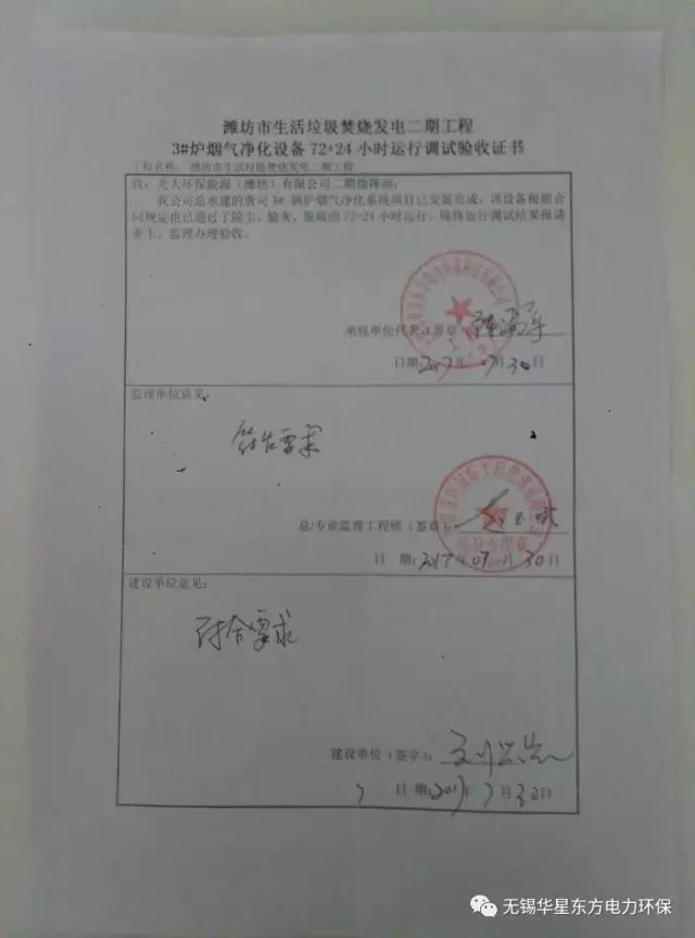 2017年7月30日,我公司承建的山東濰坊3x500t/d生活垃圾焚燒廠二期工程通過(guò)72+24小時(shí)試運(yùn)行。