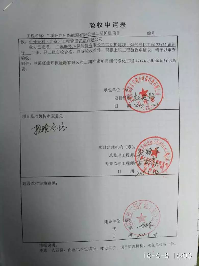 我公司中標承建的浙江蘭溪1x400t/d生活垃圾焚燒煙氣凈化工程于2018年5月24通過72+24小時驗收,并通過了整體竣工驗收。該項目采用SNCR脫硝+旋轉霧化半干法脫酸+干法(碳酸氫鈉)+活性炭吸附+布袋除塵器+飛灰輸送+飛灰穩(wěn)定化等凈化工藝,現整個系統(tǒng)現運行穩(wěn)定,為我公司 EPC項目。