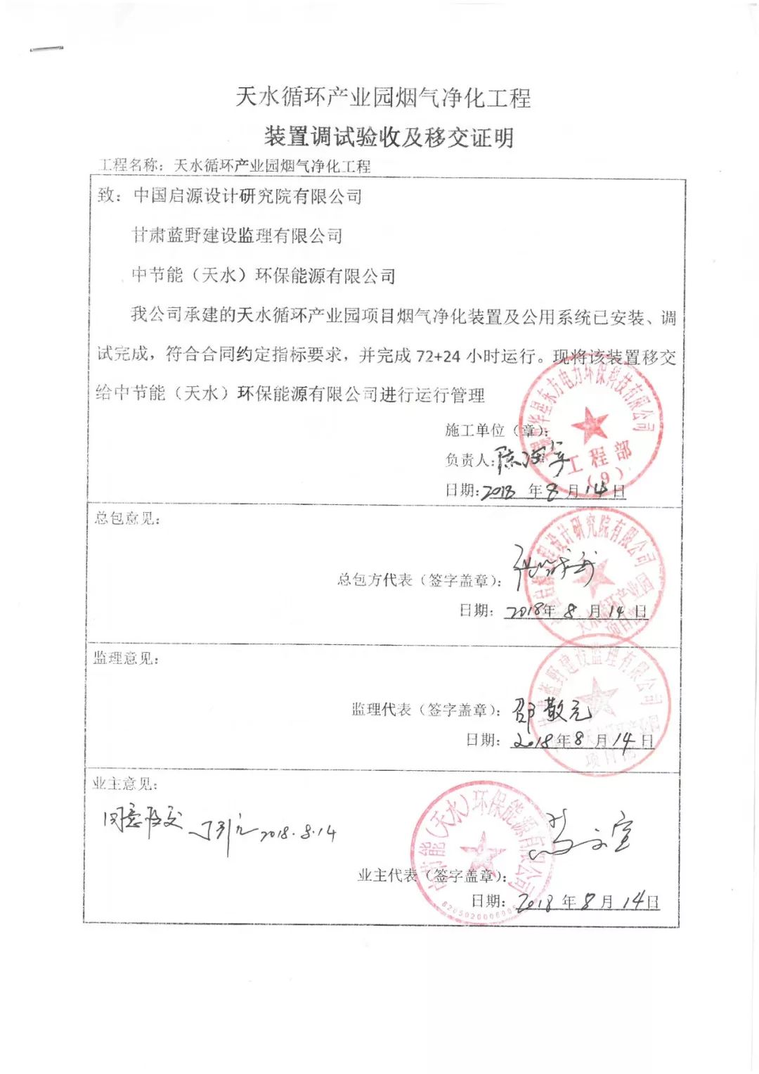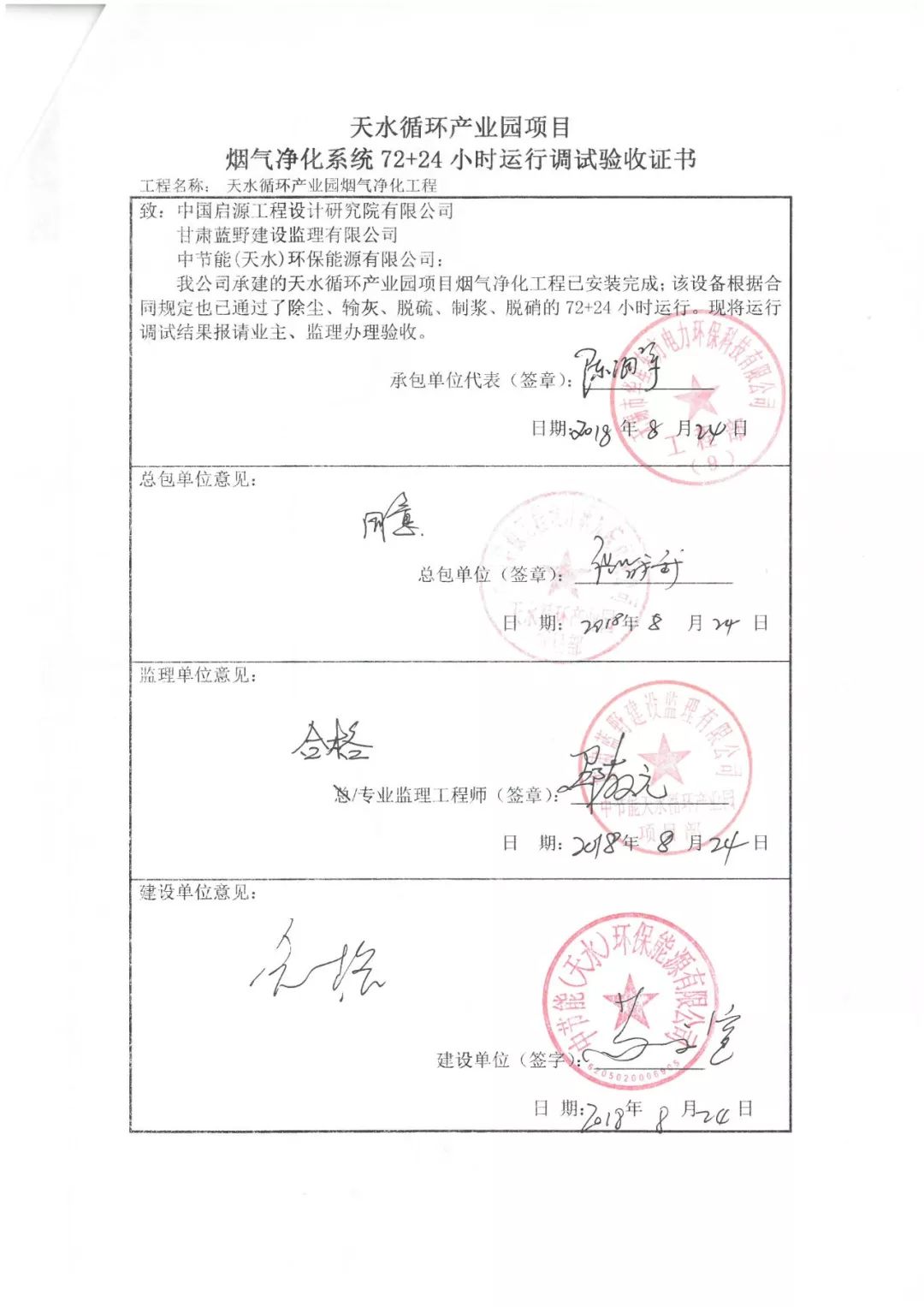 天水循環(huán)產(chǎn)業(yè)園1x600t/d生活垃圾焚燒煙氣凈化工程項目竣工驗收