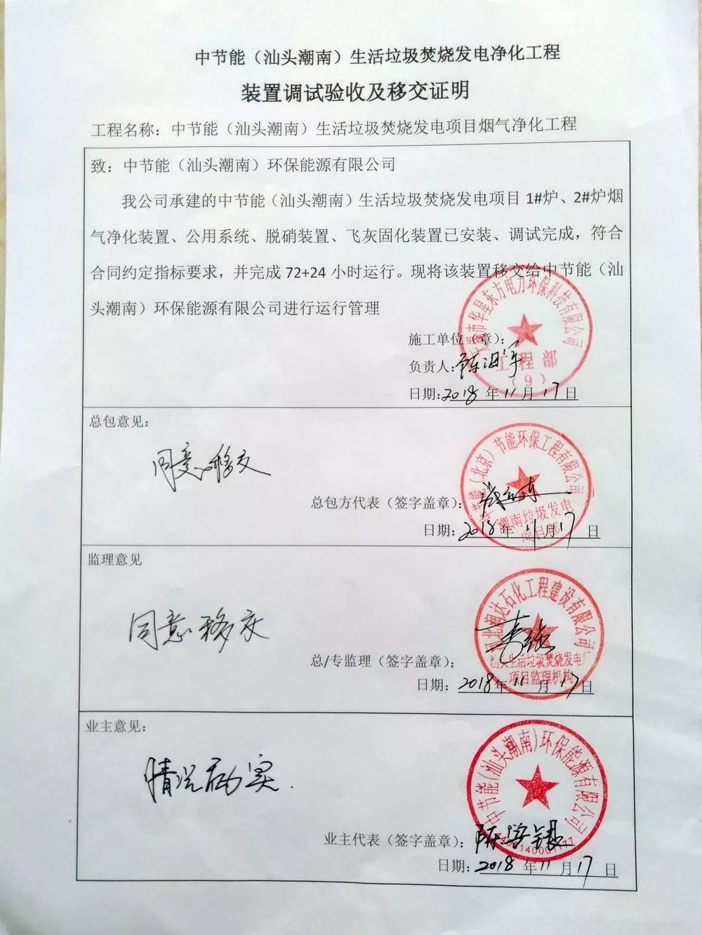 我公司承建的汕頭潮南2x500t/d生活垃圾焚燒煙氣凈化工程于2018年11月17日完成各項(xiàng)調(diào)試工作并通過驗(yàn)收。