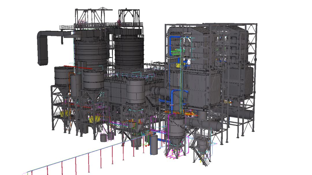 該項(xiàng)目采用了BIM模式執(zhí)行,由蘇州工廠完成了公用系統(tǒng)及其鋼結(jié)構(gòu)生產(chǎn),泰州工廠完成了吸收塔及除塵器鋼結(jié)構(gòu)和主體設(shè)備制造,無錫工廠完成了核心設(shè)備及電控設(shè)備的制造,工程部完成項(xiàng)目的現(xiàn)場設(shè)備栓接組裝和系統(tǒng)的建設(shè)安裝。