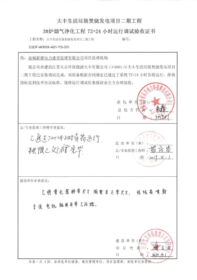 江蘇大豐1x600t/d生活垃圾焚燒發(fā)電項目二期工程3#爐煙氣凈化工程已安裝調試完成并于2019年4月1日通過72+24小時驗收。