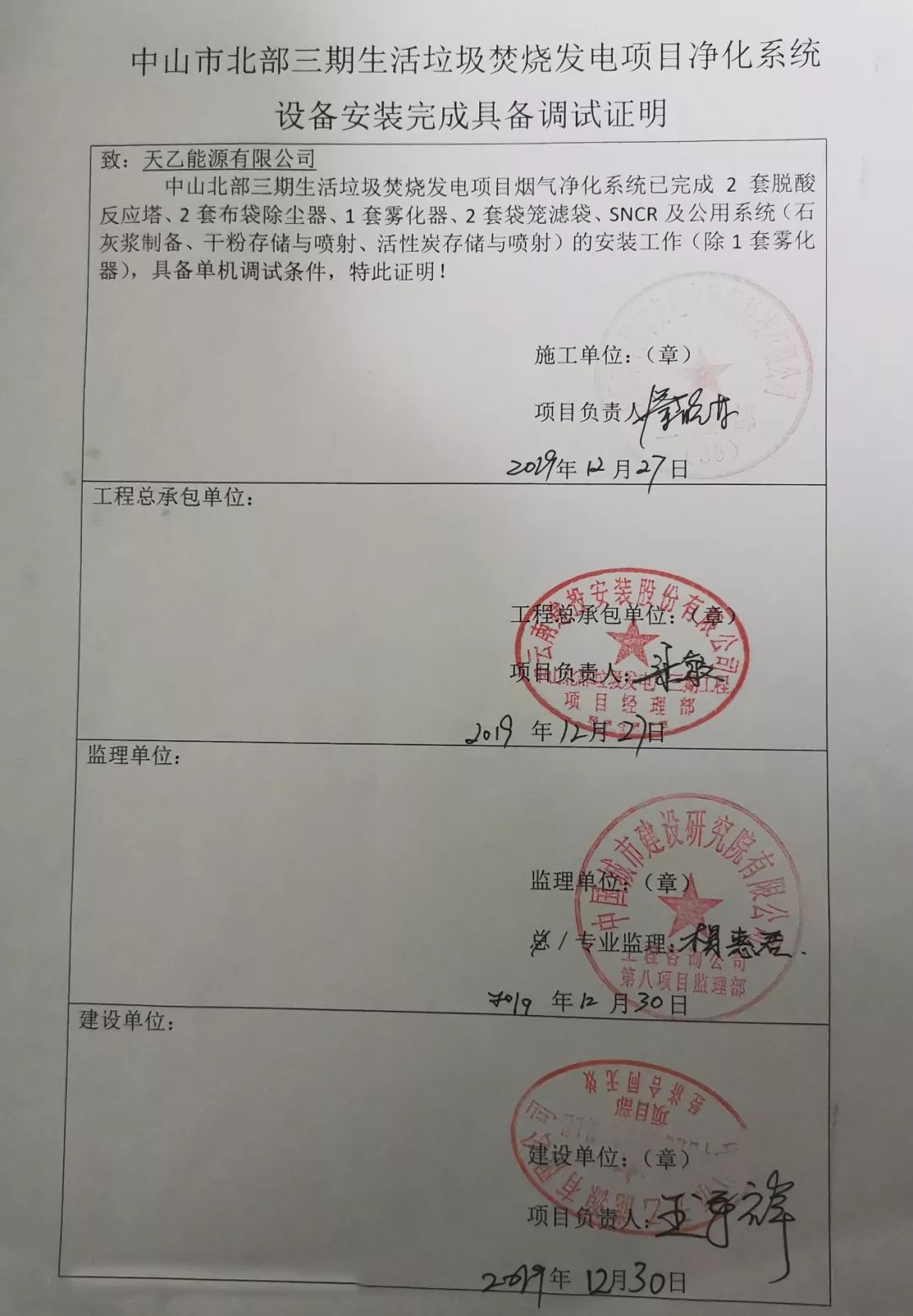 我公司承建的中山市北部垃圾綜合處理基地垃圾焚燒發(fā)電廠和垃圾滲濾液處理廠三期工程于2019年12月30日通過調(diào)試驗(yàn)收。