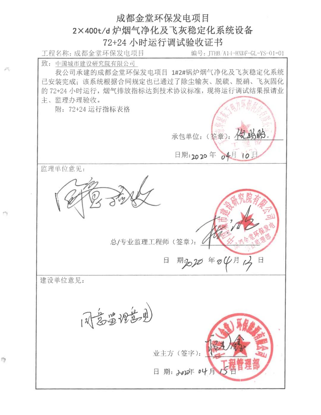 我公司承建的四川省成都市金堂縣生活垃圾焚燒2x400t/d發(fā)電項目煙氣凈化工程于2020年04月15日通過72+24小時運行驗收。