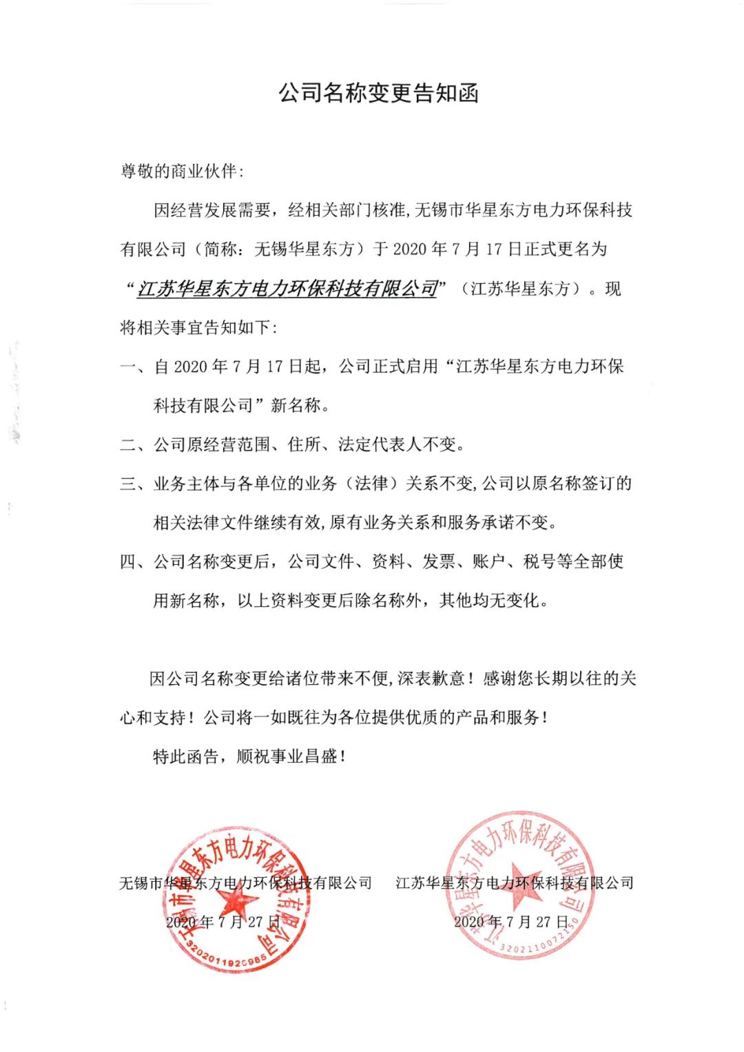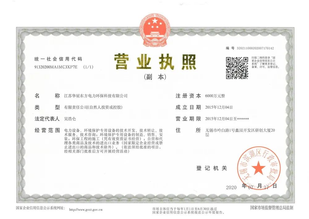 2020年7月17日,無(wú)錫市華星東方電力環(huán)??萍加邢薰菊礁麨椋骸敖K華星東方電力環(huán)??萍加邢薰尽?,以下為變更公告: