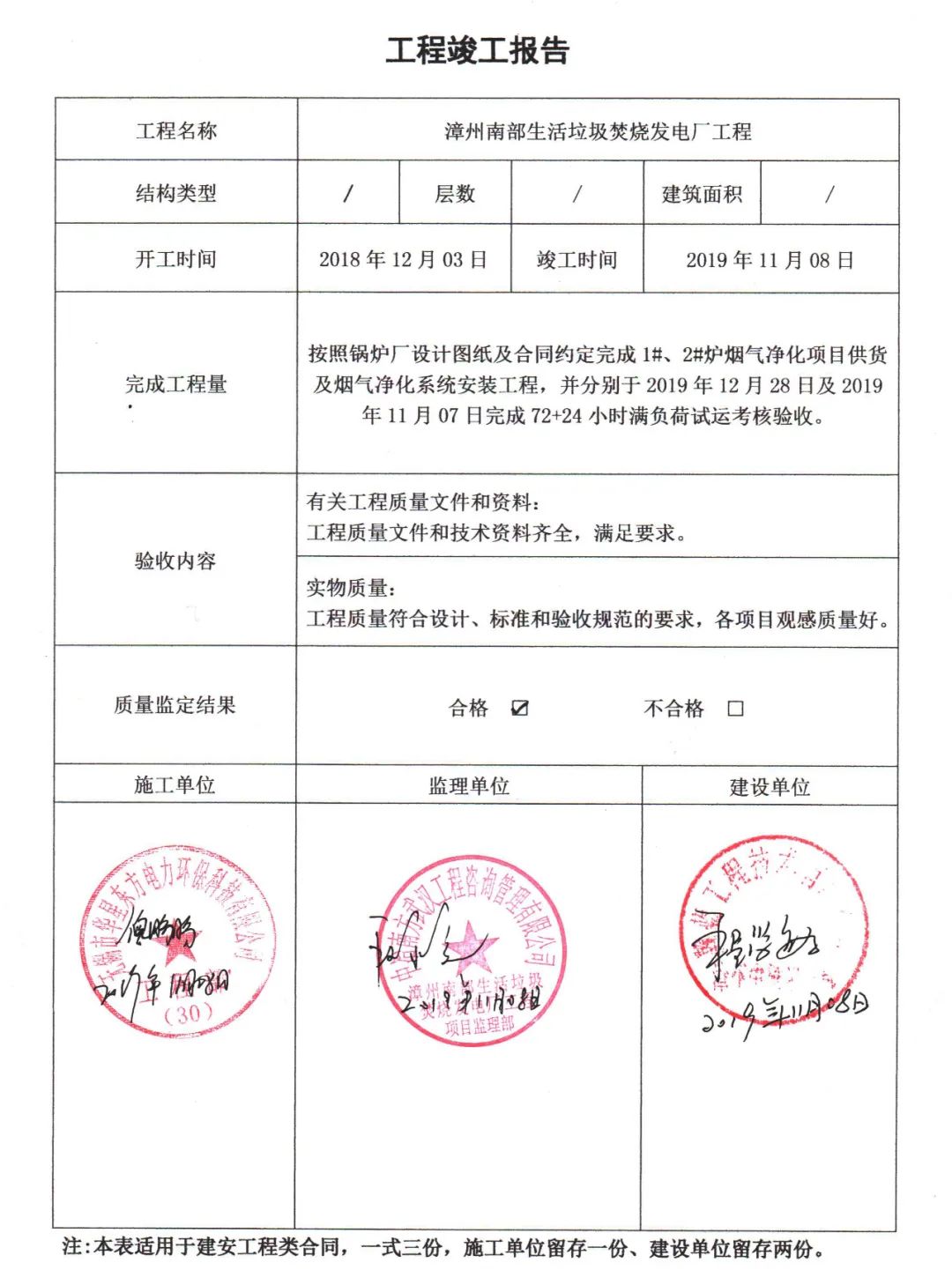 我公司承建的福建省漳州市漳州南部2x500t/d生活垃圾焚燒發(fā)電項(xiàng)目煙氣凈化工程于2019年11月8日通過(guò)竣工驗(yàn)收。