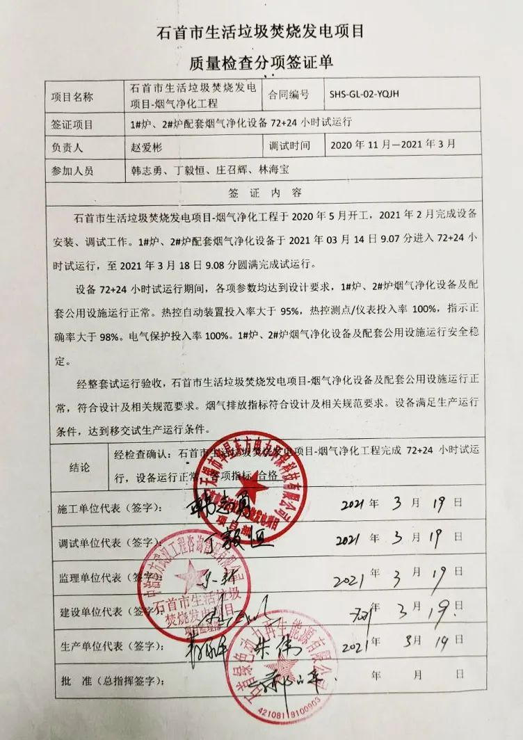 我公司承建的湖北省石首市生活垃圾焚燒發(fā)電項目煙氣凈化工程于2021年3月18日通過72+24小時試運行。