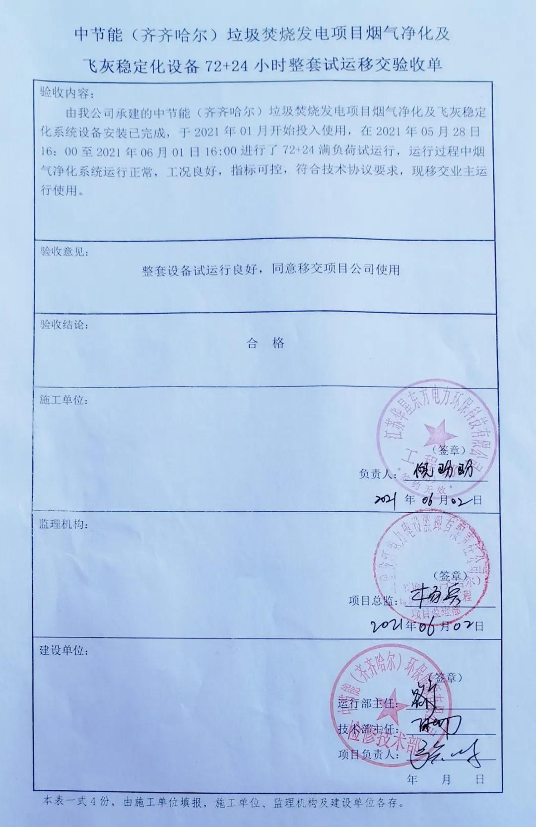 我公司承建的黑龍江省齊齊哈爾垃圾焚燒發(fā)電項(xiàng)目煙氣凈化工程于2021年6月2日通過72+24小時(shí)試運(yùn)行。