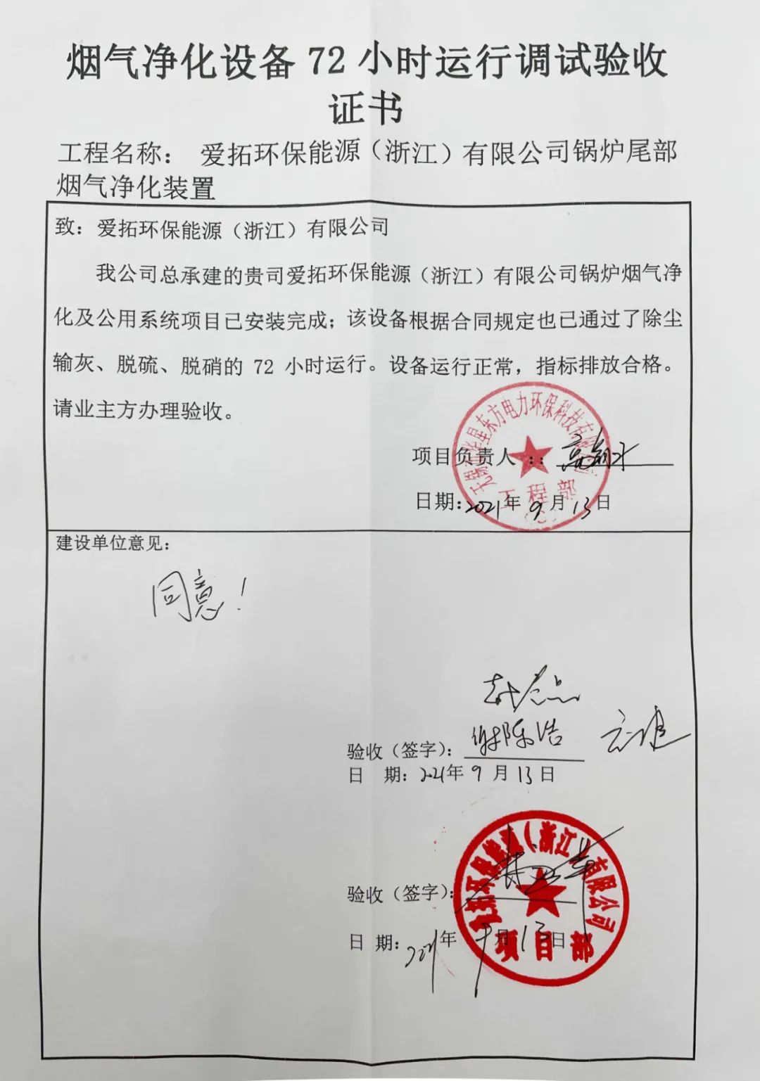 我公司承建的浙江省愛拓環(huán)保能源(浙江)有限公司鍋爐尾部煙氣凈化工程于2021年9月13日通過72+24小時試運(yùn)行。