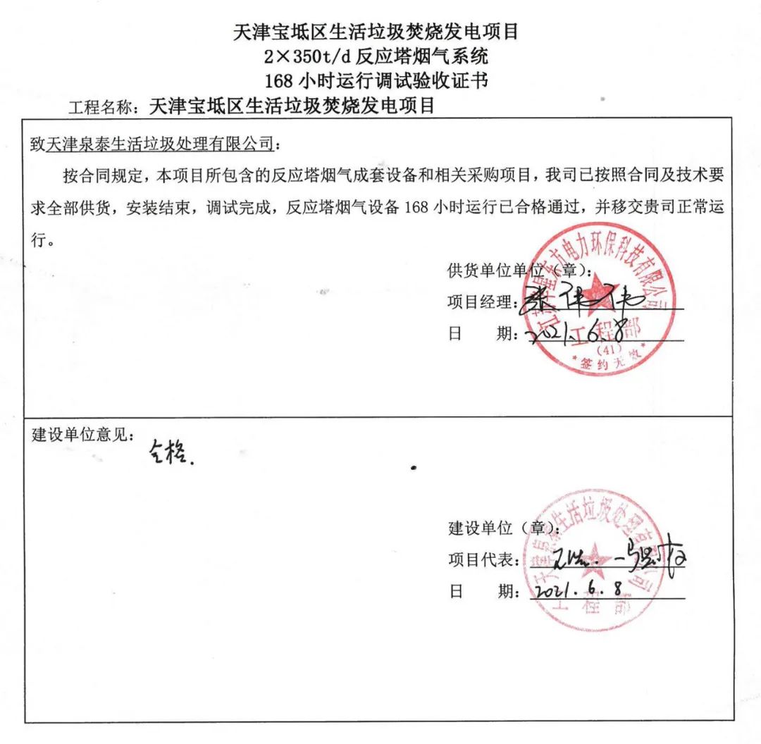 我公司承建的天津?qū)氎鎱^(qū)生活垃圾焚燒發(fā)電項目煙氣凈化工程于2021年6月8日通過72+24小時試運行。