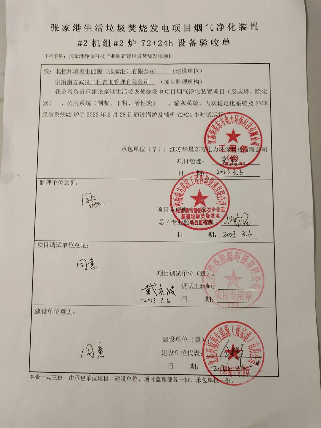 我公司承建的江蘇省張家港市靜脈產(chǎn)業(yè)園生活垃圾焚燒發(fā)電項目煙氣凈化工程于2023年02月28日通過72+24小時試運行。 The flue gas purification project of domestic Incineration power generation project in Zhangjiagang Vein Industrial Park, Jiangsu Province, contracted by Jiangsu Huaxing East, passed 72+24 hour trial operation.