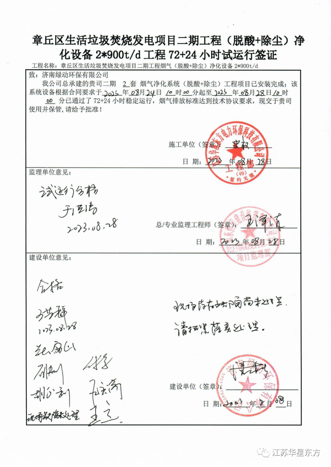 華星東方承建的山東省濟(jì)南市章丘生活垃圾焚燒發(fā)電項(xiàng)目二期煙氣凈化工程通過(guò)72+24小時(shí)試運(yùn)行