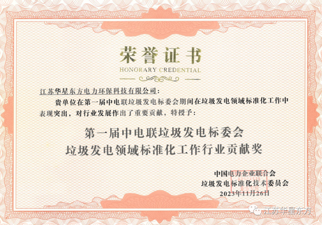 江蘇華星東方榮獲中電聯(lián)垃圾發(fā)電標(biāo)委會(huì)“垃圾發(fā)電領(lǐng)域標(biāo)準(zhǔn)化工作行業(yè)貢獻(xiàn)獎(jiǎng)”