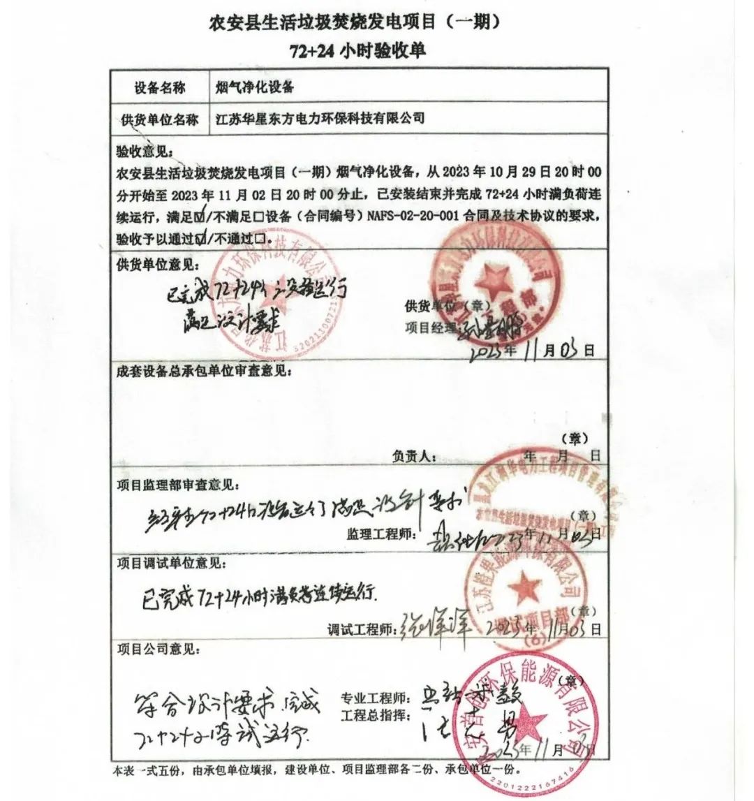 我公司承建的吉林省長(zhǎng)春市農(nóng)安生活垃圾焚燒發(fā)電項(xiàng)目煙氣凈化工程于2023年11月02日通過(guò)72+24小時(shí)試運(yùn)行。 The flue gas cleaning project of agricultural household waste incineration power generation project in Changchun city, Jilin province, which was constructed by our company, passed 72+24 hours trial operation on November 02, 2023.