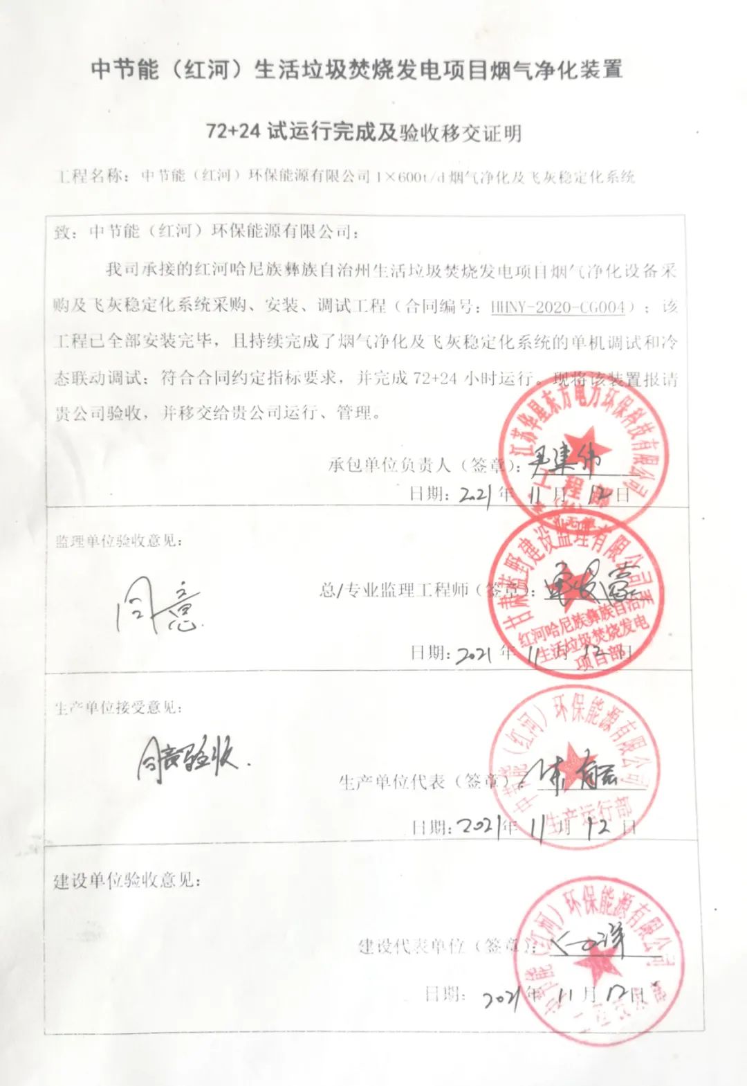 我公司承建的云南省紅河州生活垃圾焚燒發(fā)電一期項(xiàng)目煙氣凈化工程于2021年11月12日通過72+24小時(shí)試運(yùn)行。