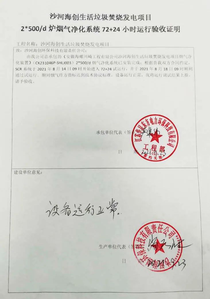 我公司承建的河北省邢臺沙河海創(chuàng)生活垃圾焚燒發(fā)電項目煙氣凈化工程于2021年6月19日通過72+24小時試運(yùn)行。