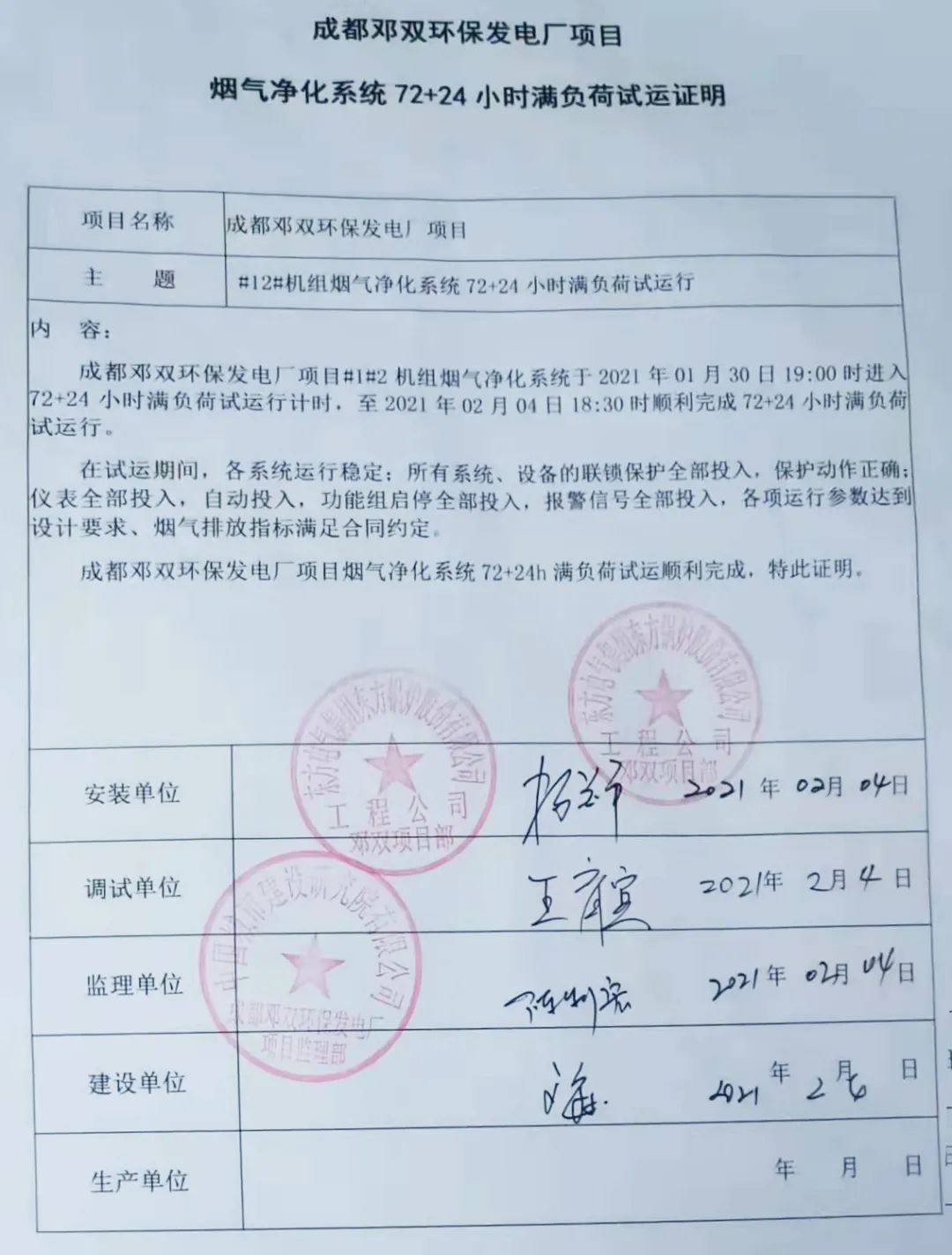 我公司承建的四川省成都市鄧雙環(huán)保發(fā)電廠項(xiàng)目煙氣凈化工程于2021年2月4日通過(guò)72+24小時(shí)試運(yùn)行。