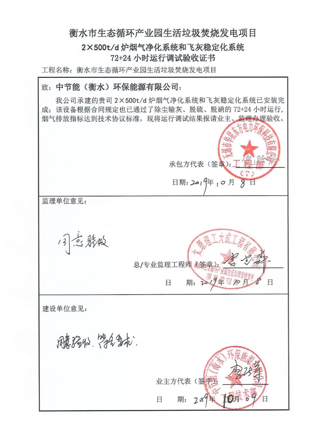 我公司承建的衡水市生態(tài)循環(huán)產(chǎn)業(yè)園生活垃圾焚燒發(fā)電項(xiàng)目煙氣凈化工程于2019年10月9日通過(guò)竣工驗(yàn)收。