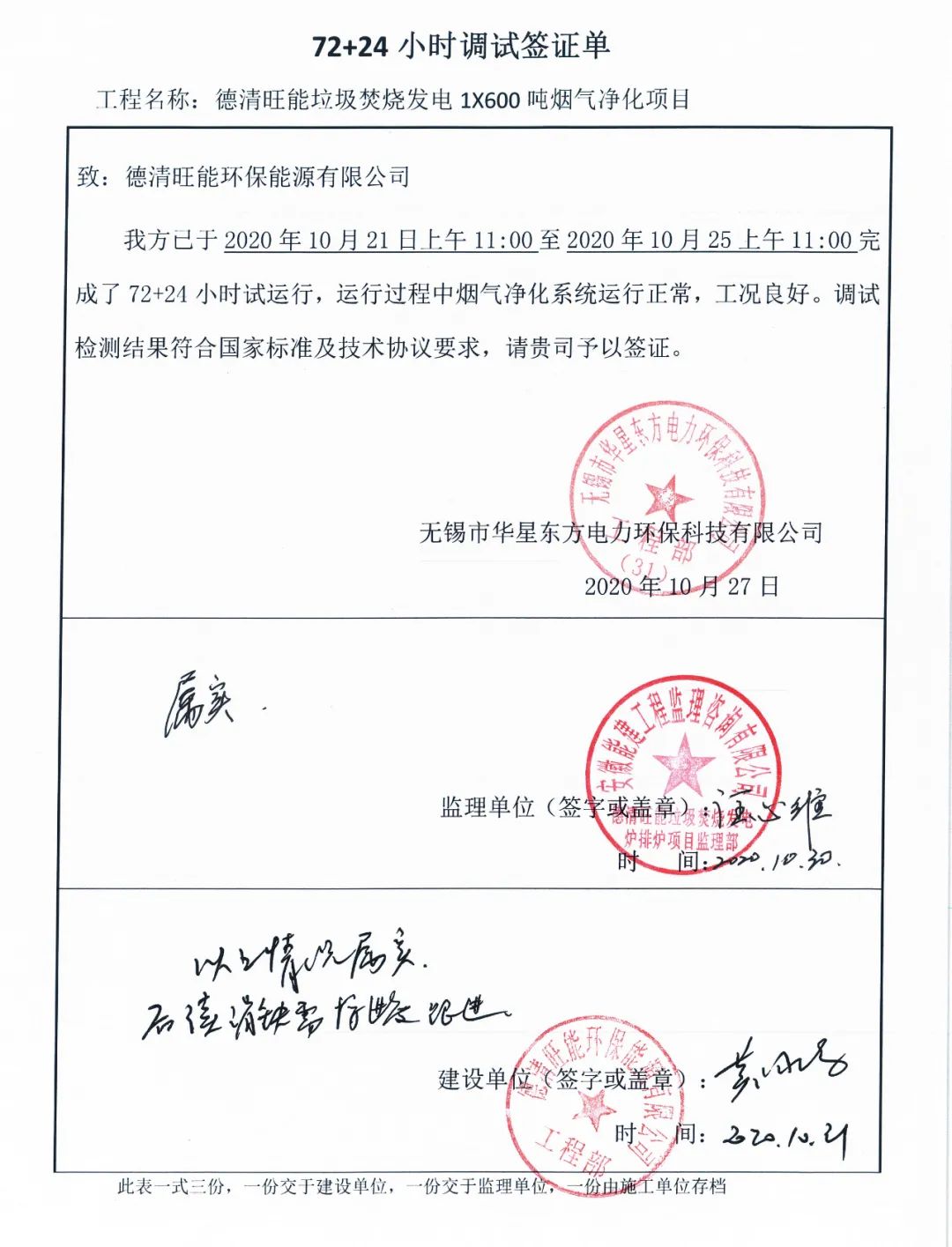 我公司承建的浙江省德清生活垃圾焚燒發(fā)電項目煙氣凈化工程于2020年10月29日通過72+24小時試運行。