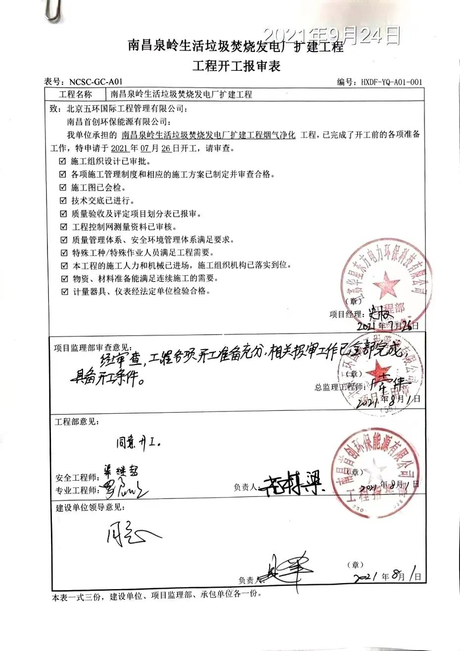 我公司承建的江西省南昌市泉嶺生活垃圾焚燒發(fā)電項(xiàng)目煙氣凈化工程于2021年7月26日開工建設(shè)。