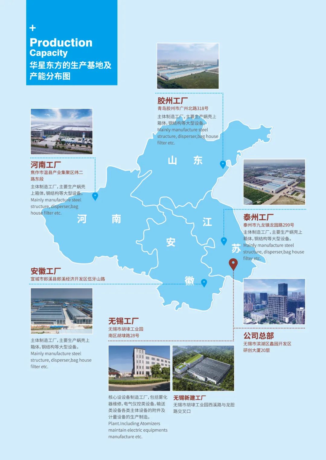 繼江蘇華星東方“安徽中易環(huán)保”平臺的設備和催化劑等生產(chǎn)裝備的投入,專注于不銹鋼,精密加工及電控產(chǎn)品為主的無錫二期工廠也將在9月陸續(xù)達產(chǎn)。江蘇華星東方自工程設計體系搬遷至無錫CBD區(qū)蠡園開發(fā)區(qū),逐步構建起以蠡園開發(fā)區(qū)為工程設計研發(fā)、無錫為精密加工、宣城為催化劑新材料、焦作、青島、泰州為鋼結構制造的產(chǎn)能體系。合理化的產(chǎn)能結構分布,為成本控制及新一輪的縣域煙氣治理需求提供了最佳選擇方案和最優(yōu)的成本控制布局。 Following Jiangsu Huaxing-east's investment in steel and catalyst fabrication machinary on the "Anhui Zhongyi EP" platform, the Wuxi Phase II factory, which focuses on stainless steel, precision machining, and electronic control products, will also gradually reach production in September, 2023. Huaxing-east relocated its engineering and design dept. to Liyuan Development Zone in CBD Wuxi, gradually building a production structure with Liyuan Development Zone as the design center, Wuxi factory as precision processing, Xuancheng factory as catalyst & new materials, and Jiaozuo / Qingdao / Taizhou as steel structure fabrication. The rational distribution of production capacity provides the best choice and optimal cost control layout for the new round of county level FGC demands.