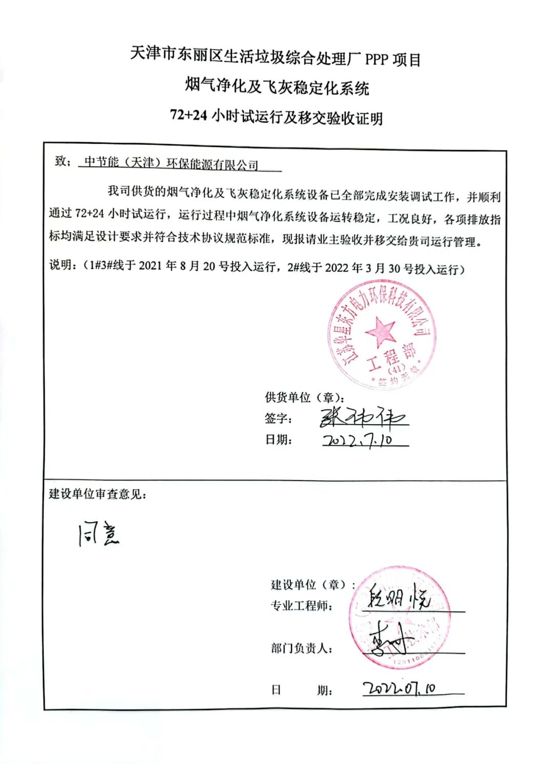 我公司承建的天津市東麗區(qū)生活垃圾焚燒發(fā)電項目煙氣凈化工程于2022年07月10日通過72+24小時試運行。 The FGC project undertaken by Huaxing for the waste incineration plant in Dongli, Tianjin passed 72+24 hours trial operation on July 10, 2022.